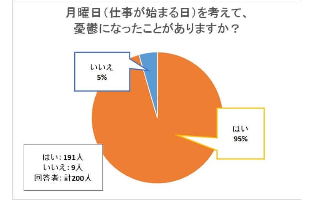 実際、やる気スイッチグループ社が行ったアンケート調査によると、20代~50代の会社員に「月曜日のことを考えて憂鬱になったことがあるか?」と聞いたところ、全体の95%にあたる191人が「はい」と回答していたそうです。