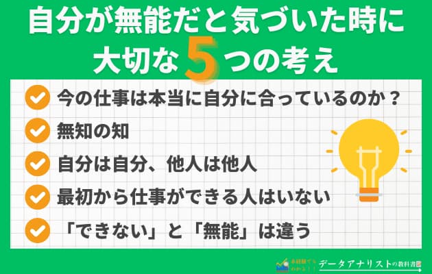 ここでは、自分が無能だと気づいた時に大切にすべき5つの考え方をご紹介します。