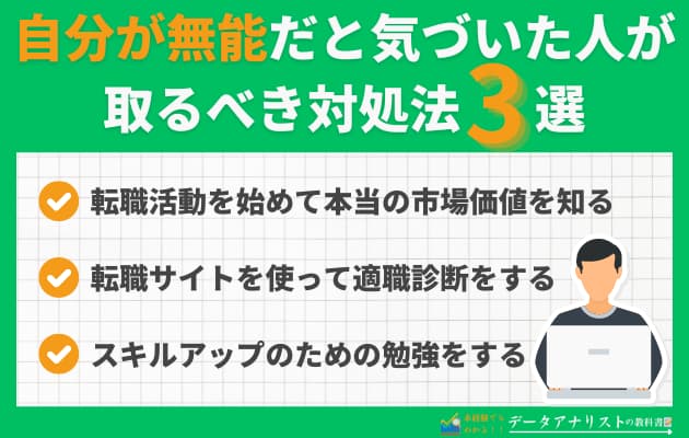 そこでこの記事では、無能だと感じた時に取るべき対処法を3つご紹介し、あなたが前向きに行動できるようにサポートします。