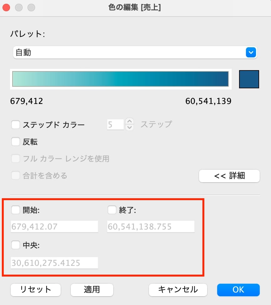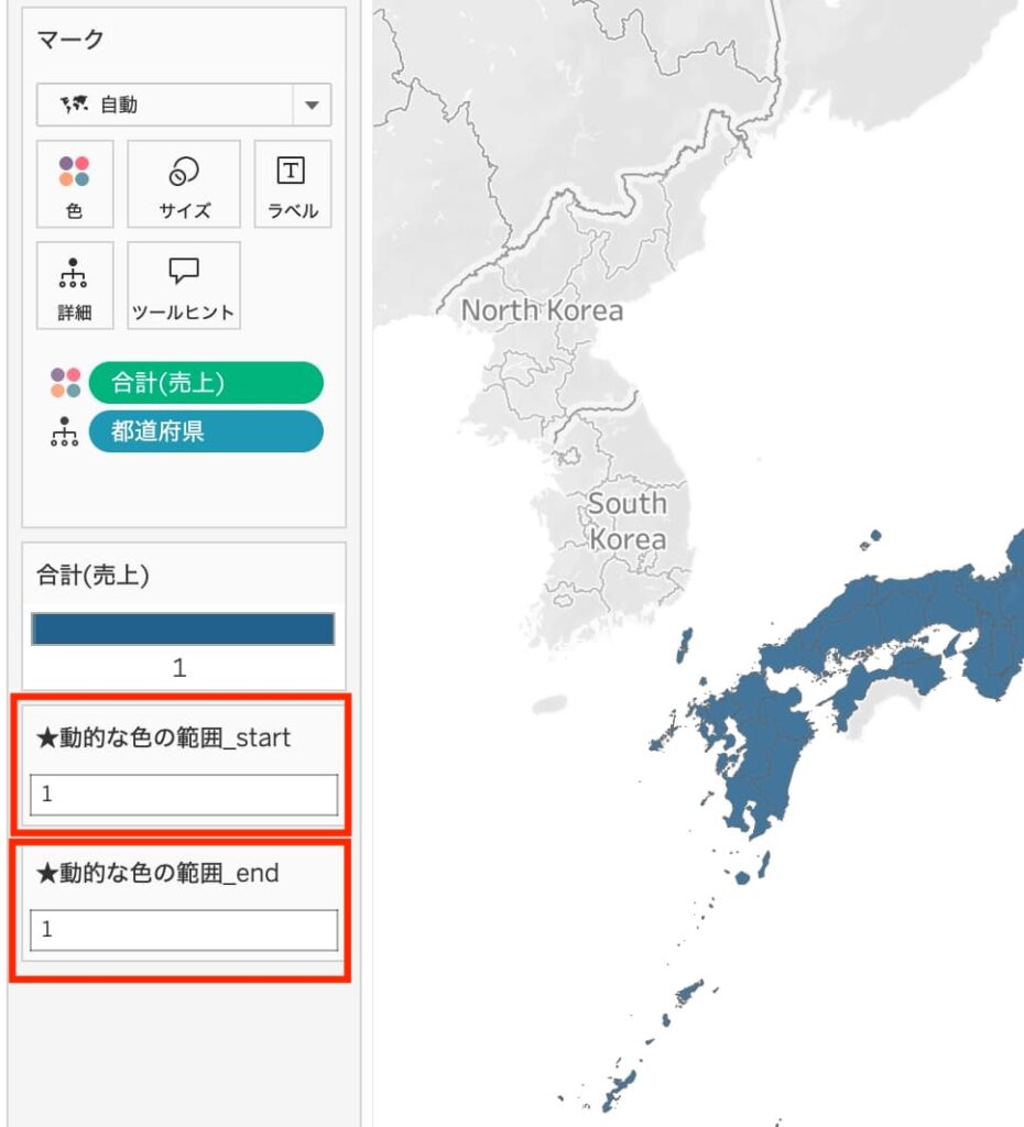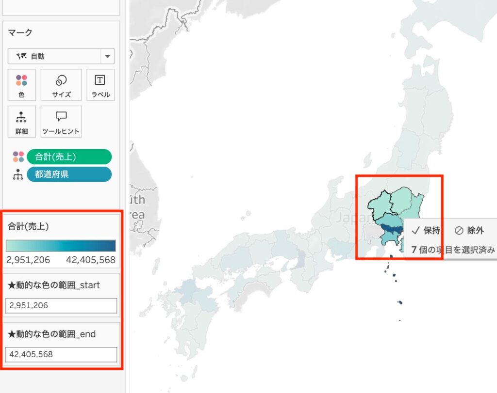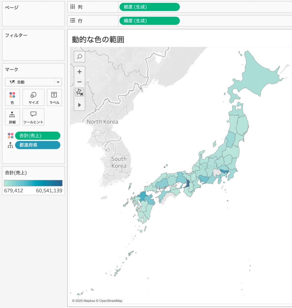 今回は「都道府県別の合計売上マップ」をもとに、動的な色の範囲を設定してみます。