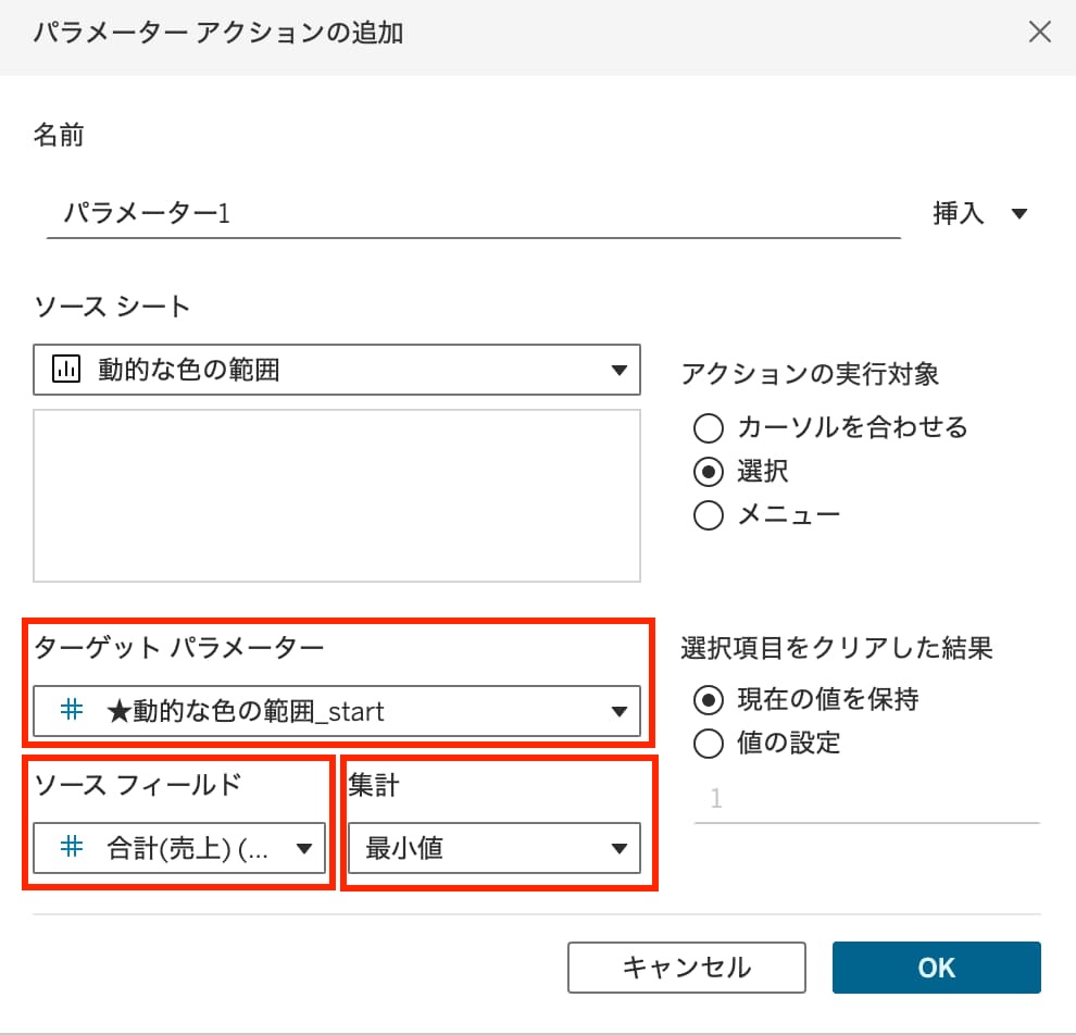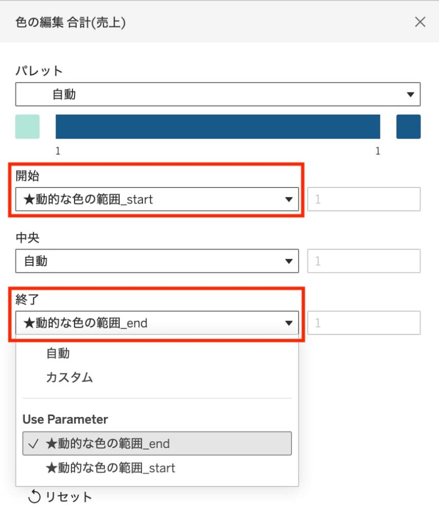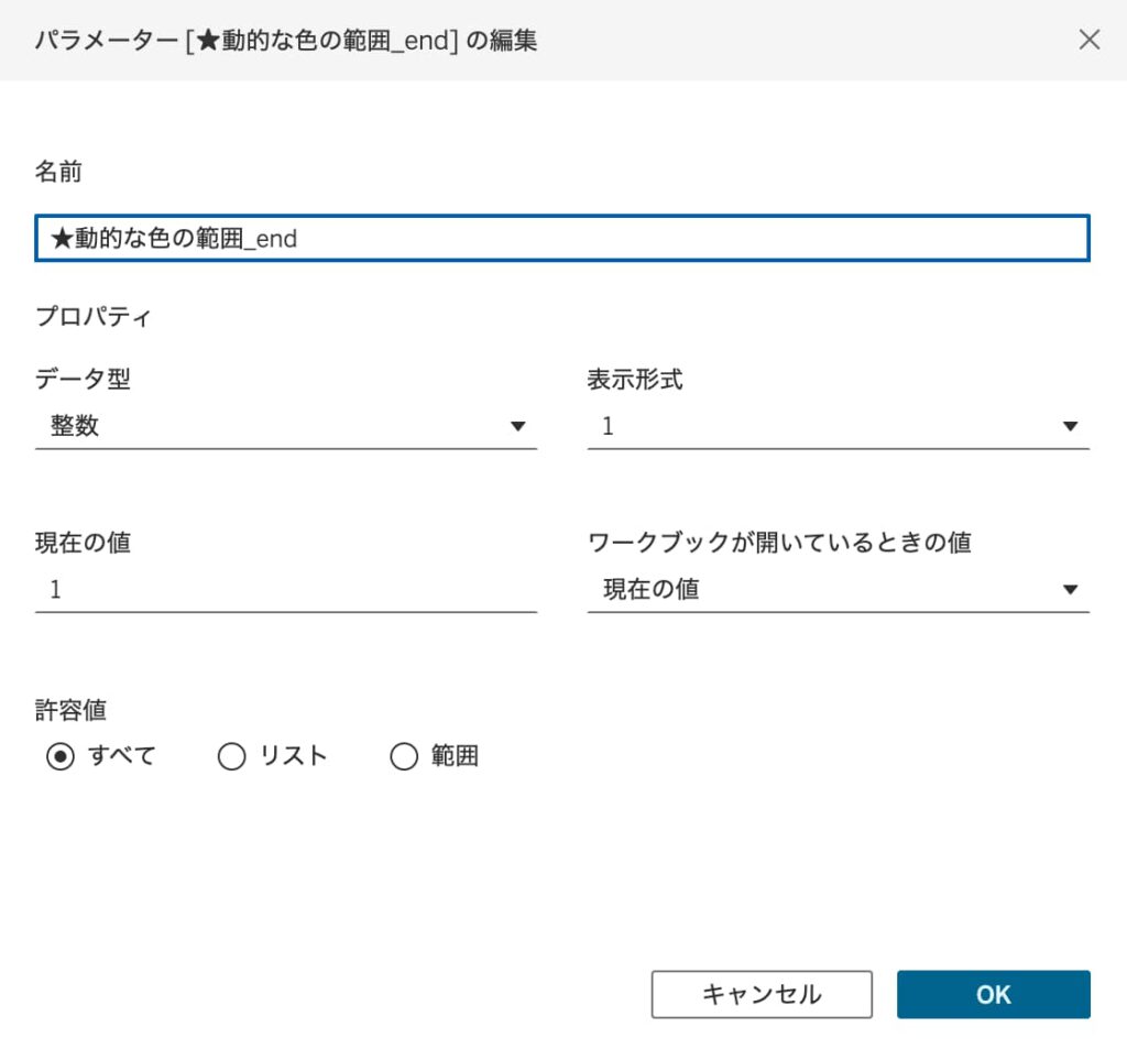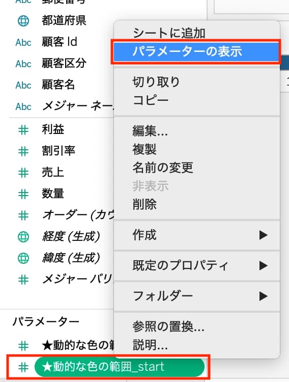 [★動的な色の範囲_start]と[★動的な色の範囲_end]をそれぞれ右クリック>パラメーターの表示 から、ワークシート上にパラメーターを表示させます。