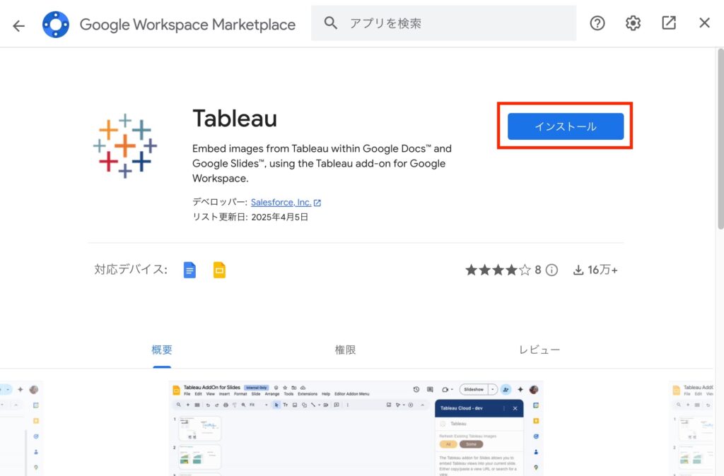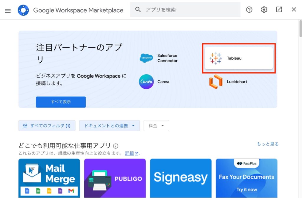 Google Workspace Marketplaceに飛ぶので、「Tableau」をクリックしてインストールを行いましょう。