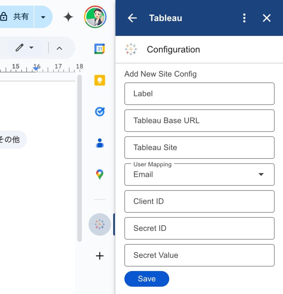 追加したTableauアプリをクリックすると、以下のような設定画面になります。