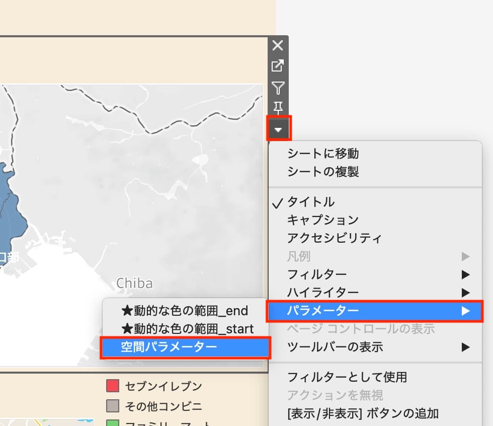 2つのマップのいずれかを選択し、▼>パラメーター>空間パラメーター から、ダッシュボード上に空間パラメーターを表示します。