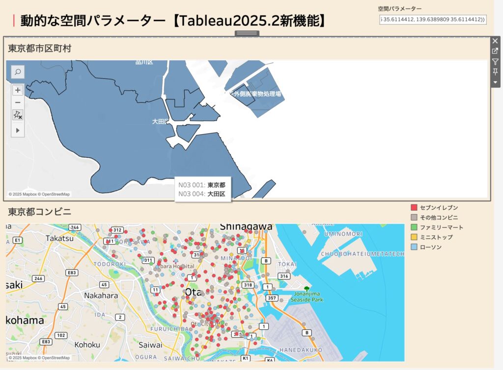 これで、「東京都市区町村」シートの表示領域に応じて「東京都コンビニ」シートの表示領域が動的に変更されます。