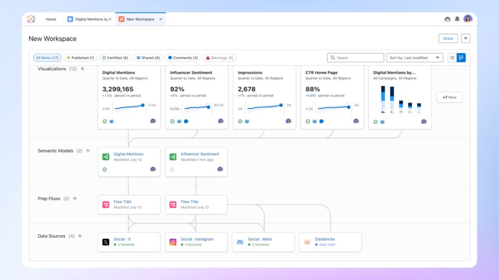 分析機能のあらゆる要素(データソース、準備フロー、セマンティックモデル、ダッシュボード、AIエージェントなど)がモジュール化されており、それらを組み合わせ(Composable)て新たな分析アプリケーションを構築できます。
