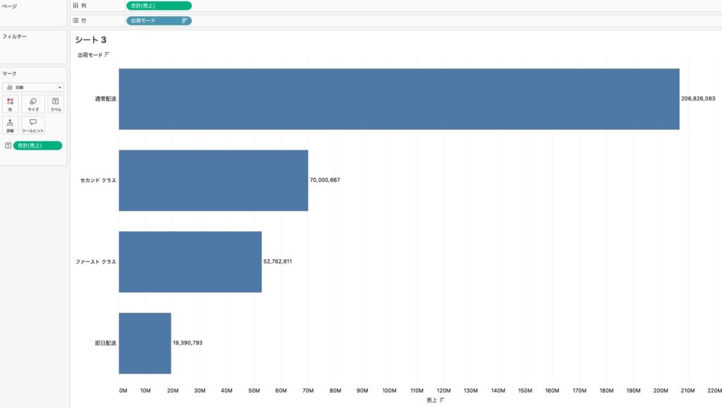今回は、出荷モード別の売上(棒グラフ)を作成し、降順に並べ替えました。