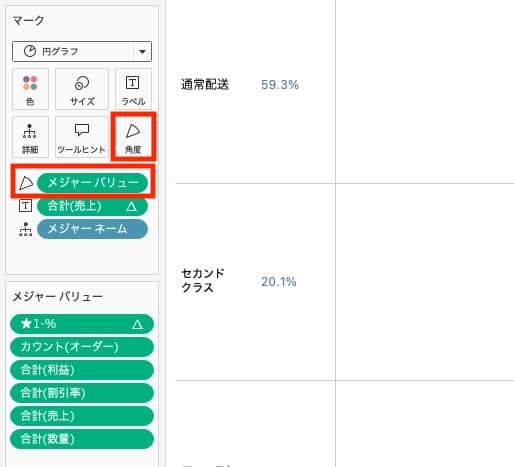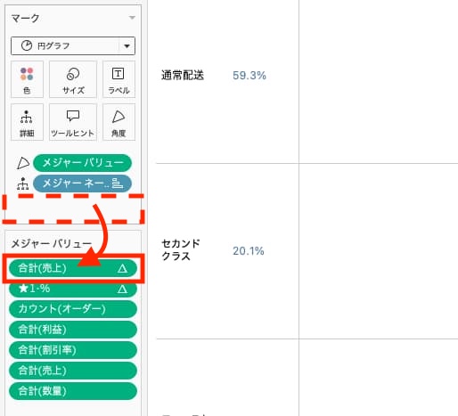 - ラベルにある[合計(売上)]をメジャーバリューシェルフの中に入れる