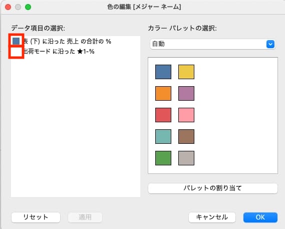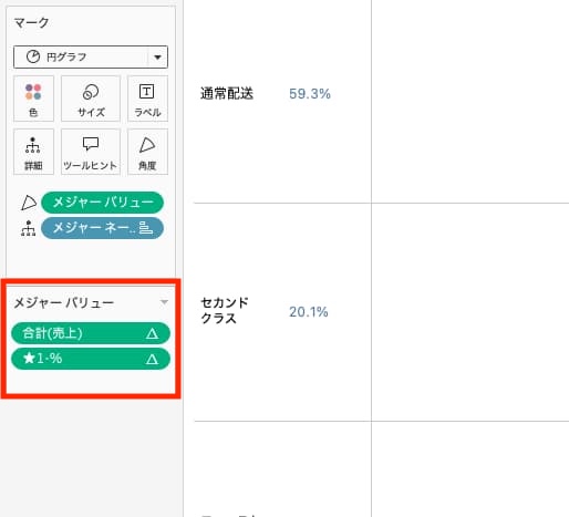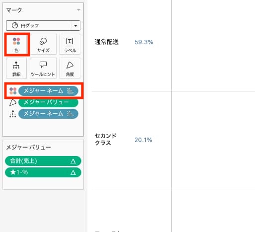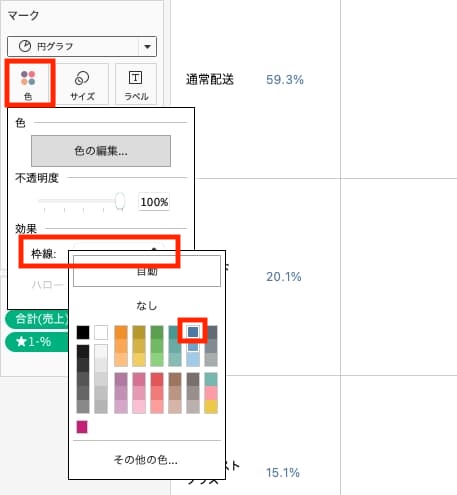 - マークカードの「色」>色の編集 から、「表(下)に沿った売上の合計の%」を青色(=円グラフに付けたい色)に、「出荷モードに沿った★1-%」を白色にする