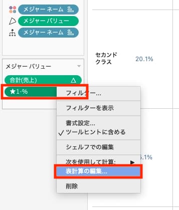 - メジャーバリューカードにある[★1-%]を右クリック>表計算の編集 をクリック