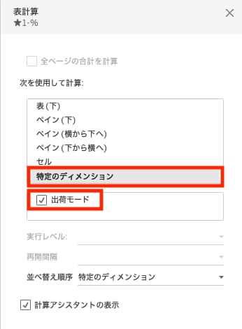 ディメンション(今回は[出荷モード])の各項目に対する「全体に対する割合」を算出するために、新しい計算フィールド(下記)を作成します。