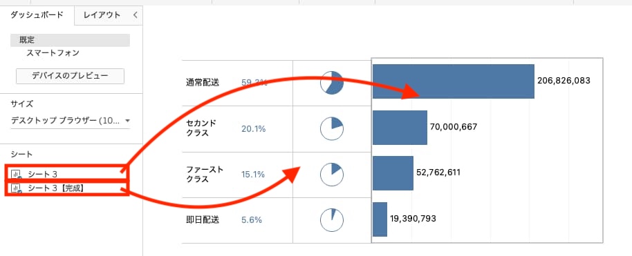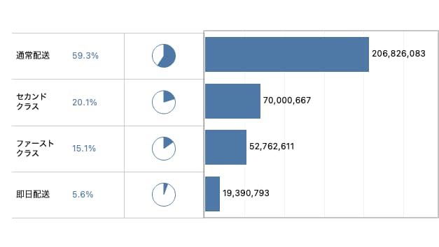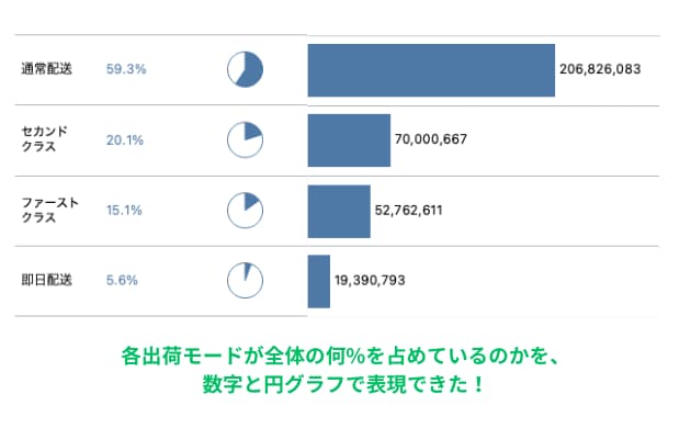 各出荷モードの売上(棒グラフ)の隣に、それぞれが全体の何%を占めているのかを「数字」と「割合(円グラフ)」両方で表現することができました。