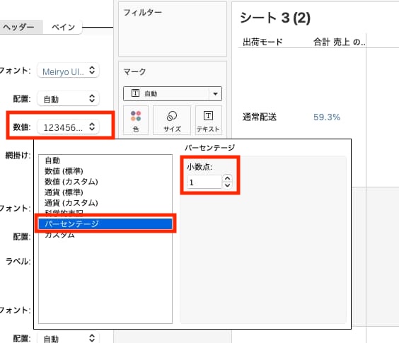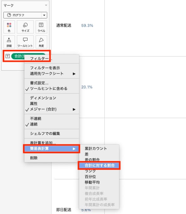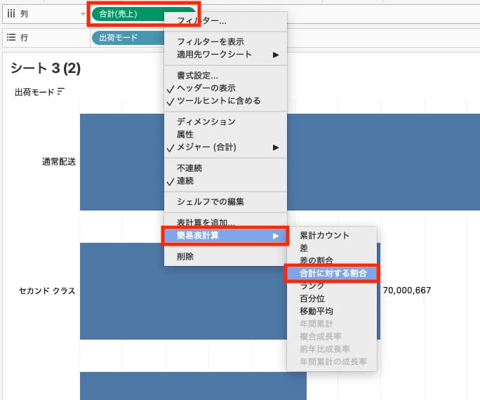 列シェルフにある[合計(売上)]を右クリック>簡易表計算>合計に対する割合 をクリックします。