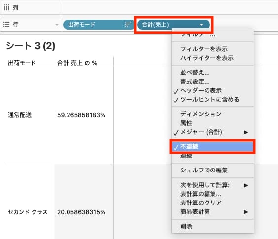 列シェルフにある[合計(売上)]に対して、以下の操作を順に行います。