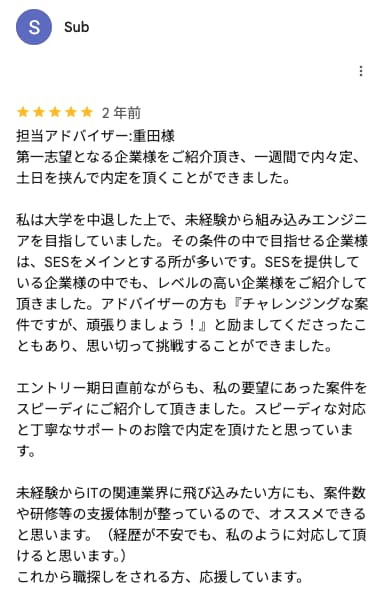 IT専門アドバイザーから丁寧なキャリアサポートを受けられ、無理に転職をすすめるようなこともないので、転職未経験者にとっても安心して利用できます。